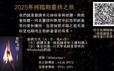 2025.9.26 週五晚上 1.0 活動開始 (林長老) https://files.hkmbc.org/2025retreat/day1-0.mp4 1.1 開始敬拜 https://files.hkmbc.org/2025retreat/day1-1b.mp4 1.2 聖經教會30年 https://files.hkmbc.org/2025retreat/final.mp4 1.3 活動禱告(孫牧師) https://files.hkmbc.org/2025retreat/day1-3.mp4 2025.9.27 週六上午...